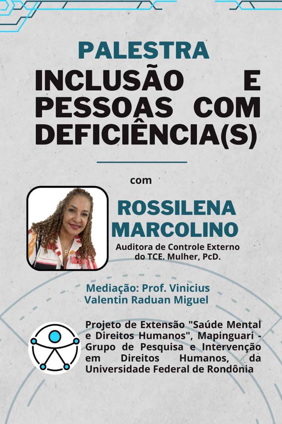 A palestrante convidada é a senhora Rossilena Marcolino, administradora, atuando como Auditora de Controle Externo do TCE, uma mulher PcD.