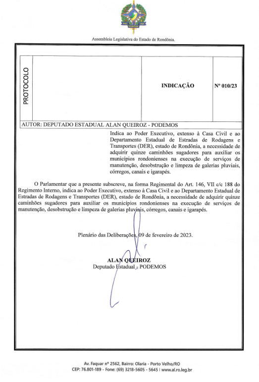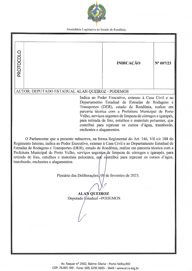 Entendendo que boas parcerias geram bons frutos, principalmente quando esferas governamentais diferentes se unem para realizar serviços em prol da população, o deputado estadual Alan Queiroz indicou ao Poder Executivo, a realização de uma parceria técnica com a Prefeitura Municipal de Porto Velho e Cacoal para a serviços urgentes de limpeza de córregos e igarapés, para retirada de lixo, entulhos e materiais poluentes, que contribui para represar os cursos d'água, transbordo e alagamentos.