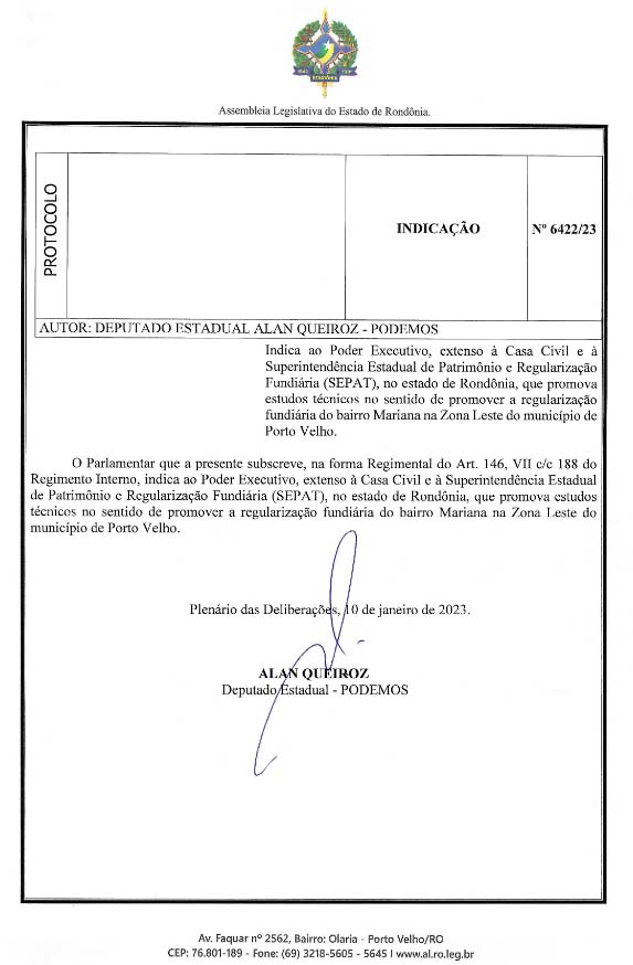 Pensando nisso, o deputado estadual Alan Queiroz indicou ao Poder Executivo, extenso à Casa Civil e à Superintendência Estadual de Patrimônio e Regularização Fundiária (SEPAT), no estado de Rondônia, que promova estudos técnicos no sentido de promover a regularização fundiária do bairro São Francisco e Mariana, ambos presentes na Zona Leste do município de Porto Velho.