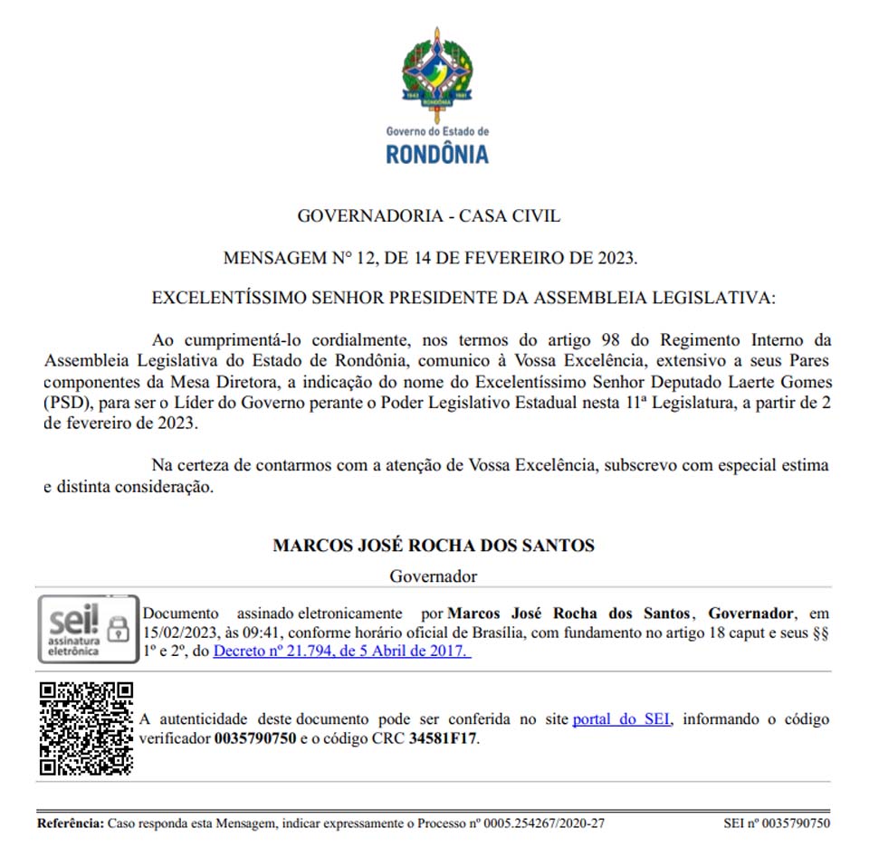 Assembleia Legislativa do Estado de Rondônia, comunico à Vossa Excelência, extensivo a seus Pares componentes da Mesa Diretora, a indicação do nome do Excelentíssimo Senhor Deputado Laerte Gomes (PSD), para ser o Líder do Governo perante o Poder Legislativo Estadual nesta 11ª Legislatura, a partir de 2 de fevereiro de 2023.