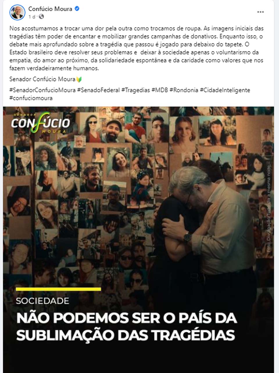 “Nos acostumamos a trocar uma dor pela outra como trocamos de roupa. As imagens iniciais das tragédias têm poder de encantar e mobilizar grandes campanhas de donativos. Enquanto isso, o debate mais aprofundado sobre a tragédia que passou é jogado para debaixo do tapete. O Estado brasileiro deve resolver seus problemas e deixar à sociedade apenas o voluntarismo da empatia, do amor ao próximo, da solidariedade espontânea e da caridade como valores que nos fazem verdadeiramente humanos.