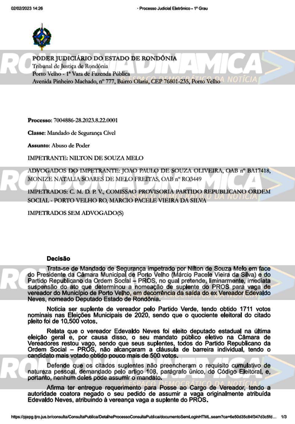 Porto Velho, RO – O suplente de vereador Nilton de Souza Melo, do PV, impetrou mandado de segurança contra o presidente da Câmara de Porto Velho, Márcio Pacele, do PSB. Na mesma demanda também fora acionado o Partido Republicano da Ordem Social (PROS).