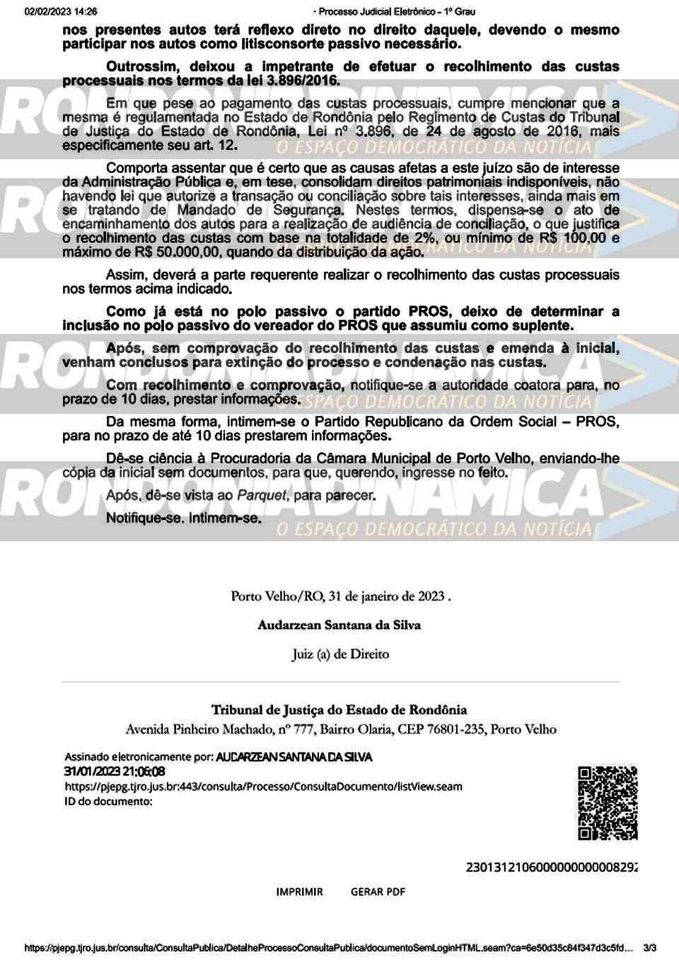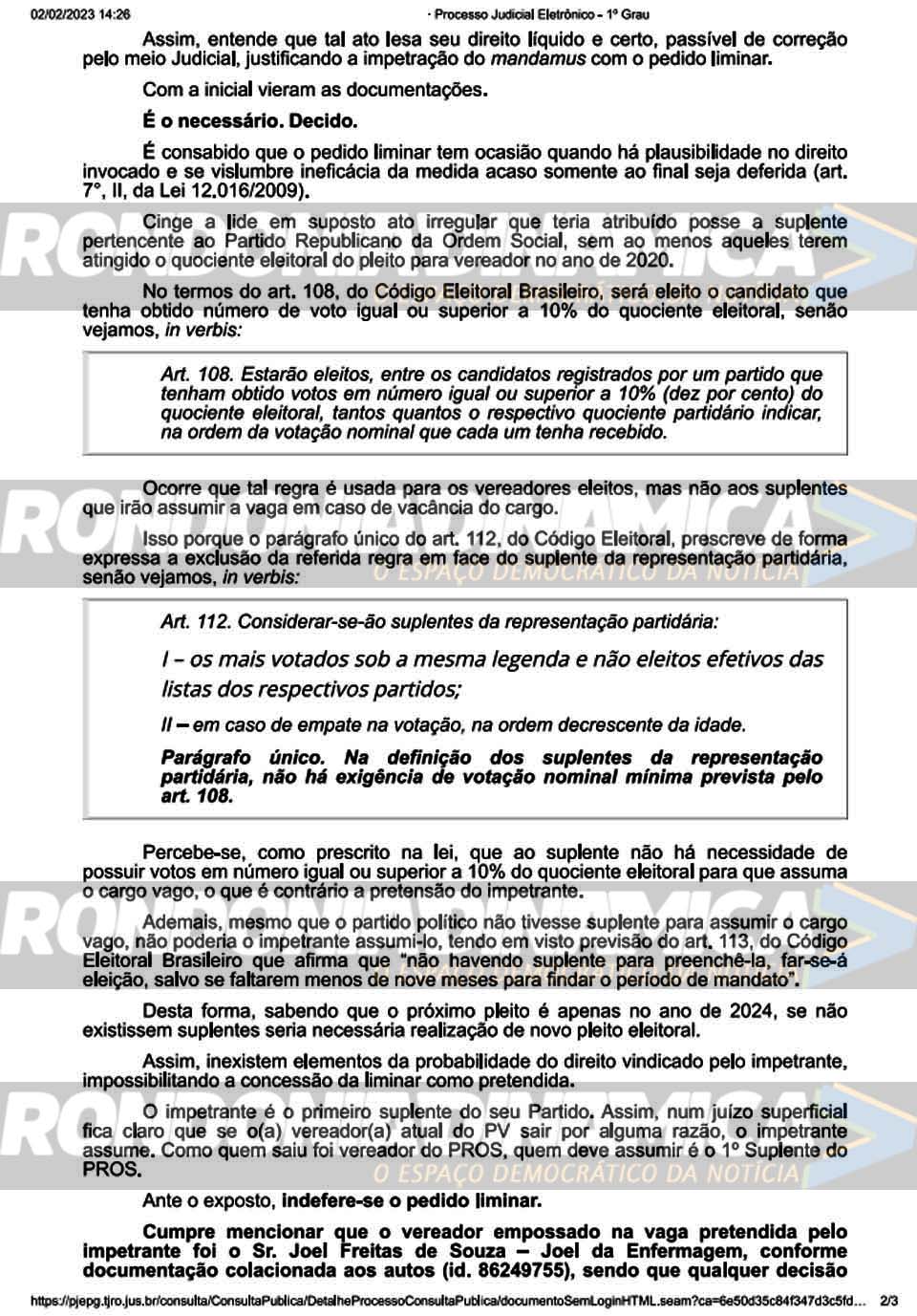 Nos autos, Melo pretendia suspender imediatamente o ato que determinou a nomeação do suplente do PROS, Joel Freitas de Souza, o Joel da Enfermagem, para vaga de vereador do Município de Porto Velho.