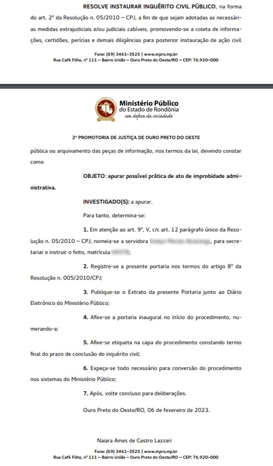 A responsável pelo procedimento é a promotora de Justiça Naiara Ames de Castro Lazzari, da 2ª Promotoria de Justiça de Ouro Preto do Oeste.