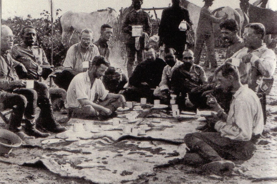 Foto: Almoço na missão Rondon-Roosevelt (1913/14), servindo de mesa, couros de veados.