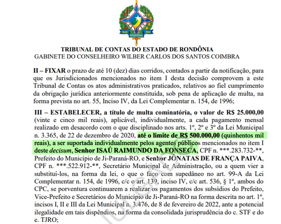Coimbra estabeleceu multa de até R$ 500 mil que pode ser aplicada individualmente ao prefeito e ao secretário de Administração em caso de descumprimento.
