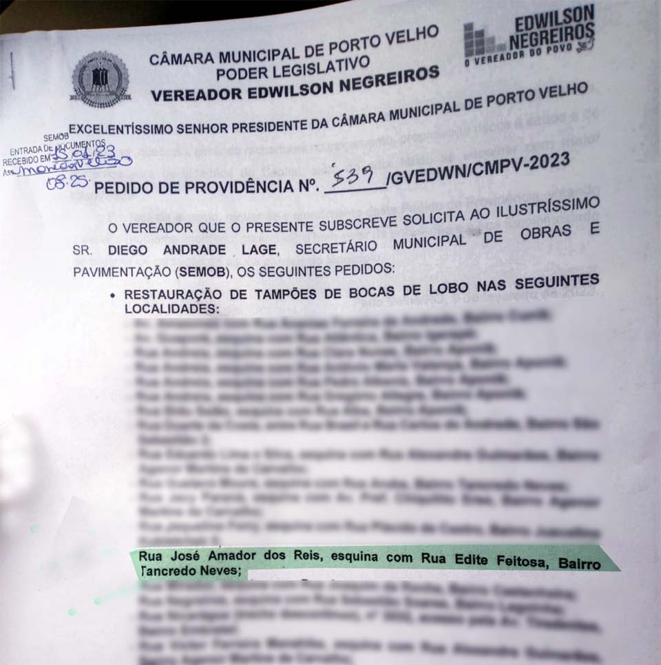 Porto Velho, RO – O vereador Edwilson Negreiros, do PSB, encaminhou Pedido de Providência solicitando a restauração de diversas bocas-de-lobo em Porto Velho à Secretaria de Obras da Capital (SEMOB).