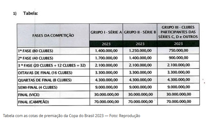 Tabela com as cotas de premiação da Copa do Brasil 2023 —