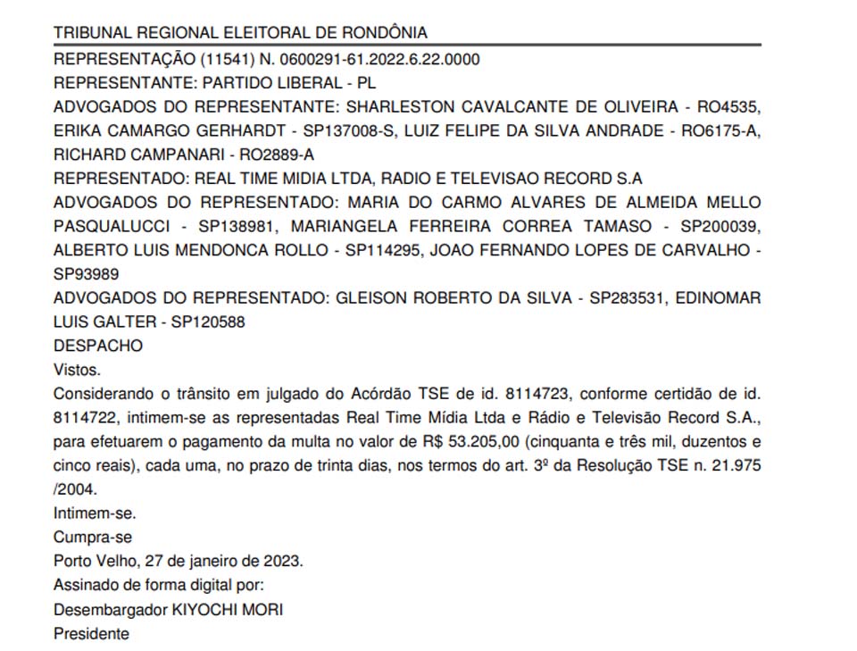 Porto Velho, RO – Com o trânsito em julgado da decisão final de Justiça Eleitoral no processo iniciado pelo Partido Liberal (PL), comandando em Rondônia pelo senador licenciado Marcos Rogério, postulante ao Governo de Rondônia derrotado em 2022, a Rede Record e o Instituto Real Time Big Data terão de pagar multa.