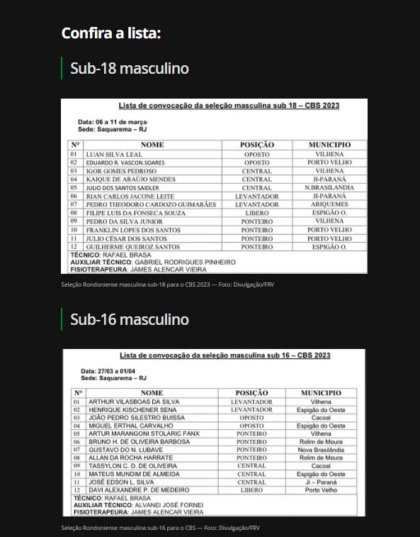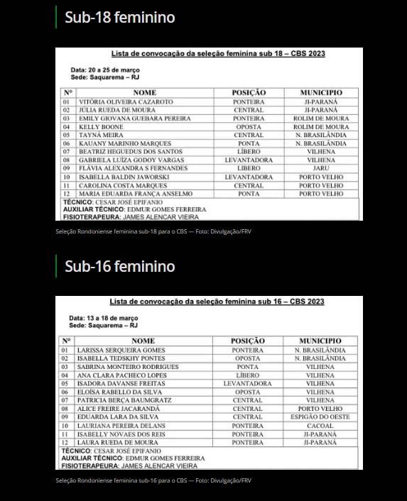 As seletivas em Rondônia para o Campeonato Brasileiro de Seleções chegou ao fim. Ao todo, 48 atletas foram convocadas, na lista divulgada pela Federação Rondoniense de Voleibol (FRV), para disputar a competição que ocorre em Saquarema (RJ), durante os meses de março e abril.