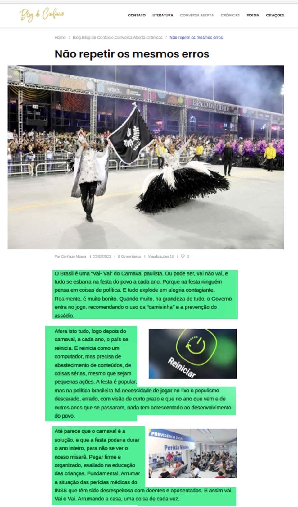 “Até parece que o carnaval é a solução, e que a festa poderia durar o ano inteiro, para não se ver o nosso miserê. Pegar firme e organizado, avaliado na educação das crianças. Fundamental. Arrumar a situação das perícias médicas do INSS que têm sido desrespeitosa com doentes e aposentados. E assim vai. Vai e Vai. Arrumando a casa, uma coisa de cada vez”, concluiu.