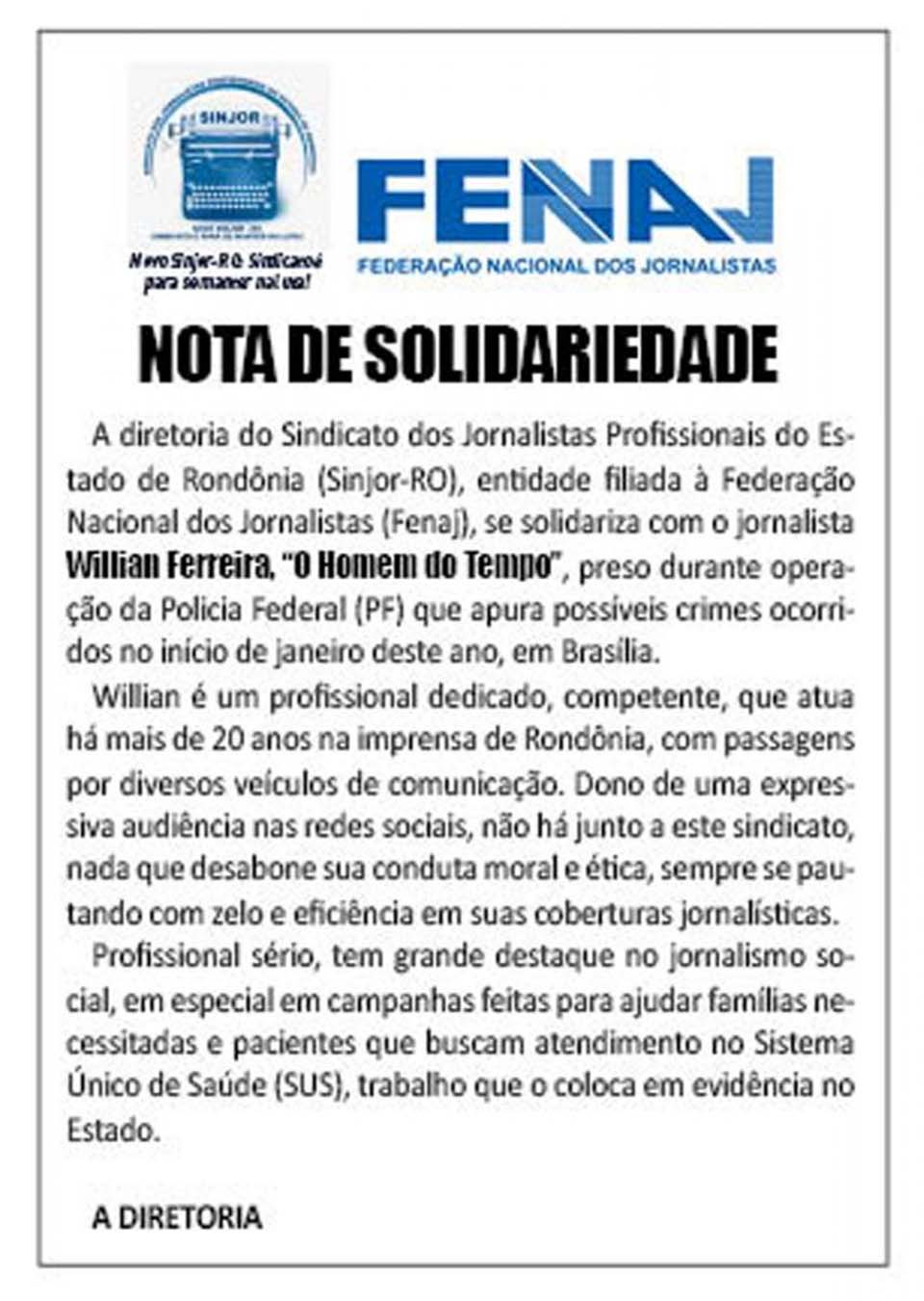 Porto Velho – O Sindicato dos Jornalistas Profissionais do Estado de Rondônia (Sinjor/RO) emitiu uma Nota de Solidariedade em nome de William Ferreira da Silva, conhecido como “Homem do Tempo”.
