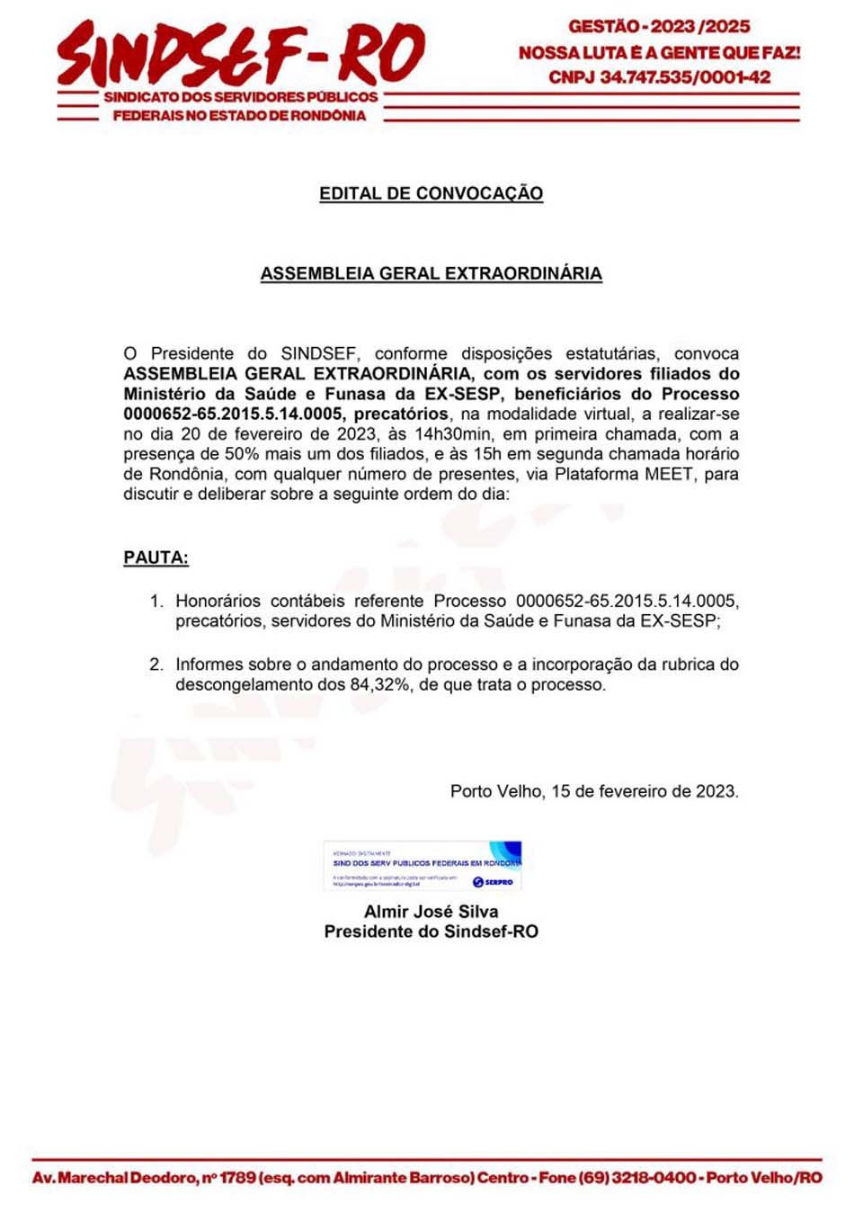 SINDSEF-RO: Edital de Convocação de Assembleia Geral Extraordinária – Ministério da Saúde, FUNASA e EX-SESP