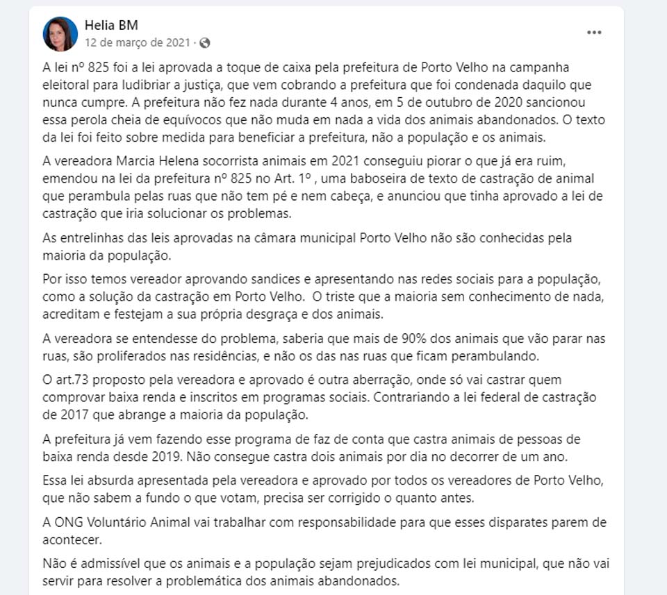 Porto Velho, RO – A vereadora de Porto Velho Márcia Helena Martins Henrique, conhecida como Márcia Socorrista de Animais, do Progressistas, moveu ação de indenização contra uma cidadã que a criticou no Facebook.