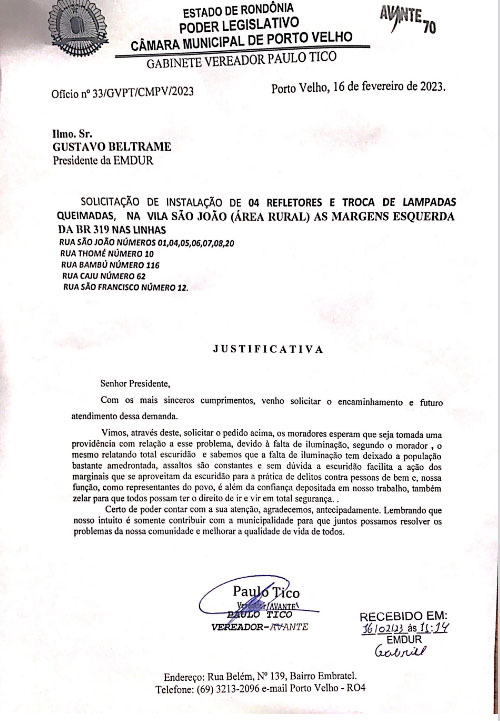 Paulo Tico fez questão de agradecer ao prefeito Hildon Chaves, ao presidente da EMDUR, Gustavo Beltrame, e toda sua equipe que trabalharam duramente o período noturno para atender à reivindicação feita pelo seu gabinete.