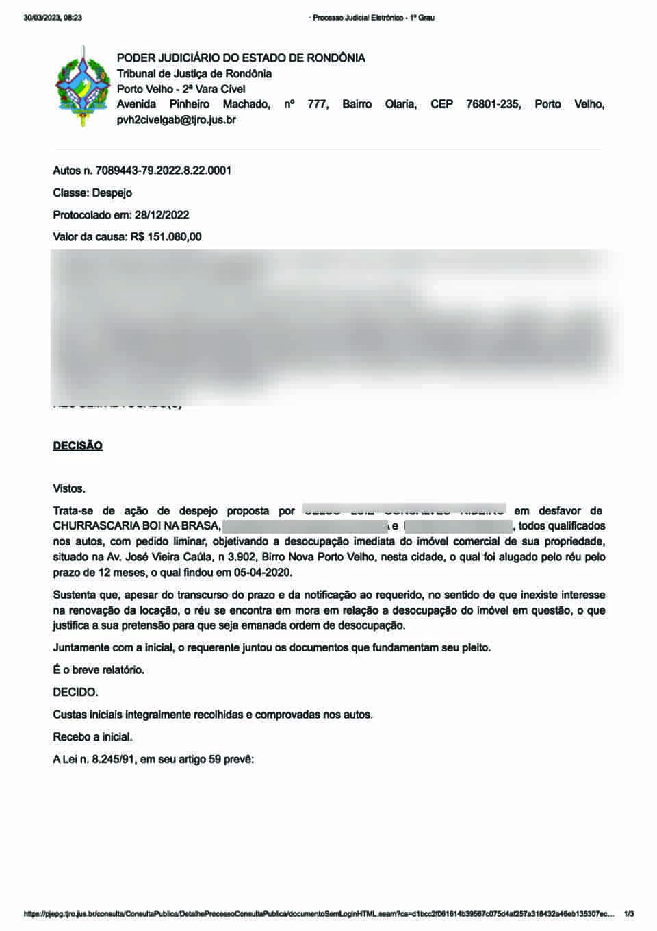 Porto Velho, RO – Atendendo ao pleito do proprietário do imóvel localizado na Avenida José Vieira Caúla, no Bairro Nova Porto Velho, o juiz de Direito Jorge Luiz de Moura Gurgel do Amaral determinou a desocupação voluntária, no prazo de 15 dias, por parte da empresa Churrascaria Boi na Brasa e seus representantes. Porém, eles ainda podem, segundo a lei, pagar uma caução (no valor de três aluguéis, monta estabelecida pelo Juízo) para se manterem enquanto respondem ao processo.