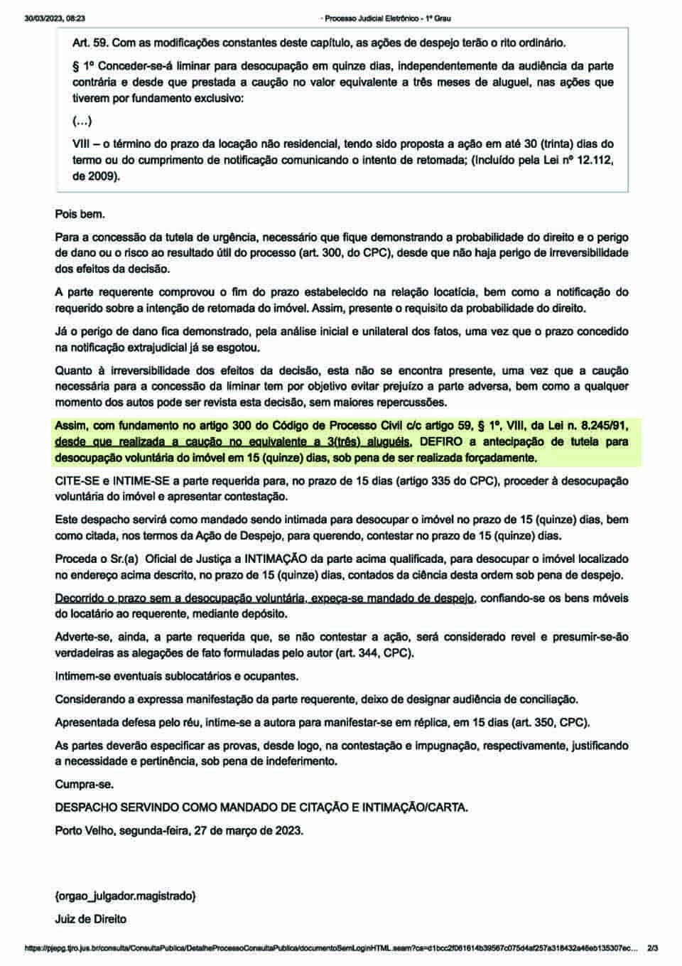 O magistrado, então, deferiu os efeitos d antecipação ode tutela “desde que realizada a caução no equivalente a 3(três) aluguéis” para [promoção de] desocupação voluntária do imóvel em 15 (quinze) dias, sob pena de ser realizada forçadamente”, alertou.