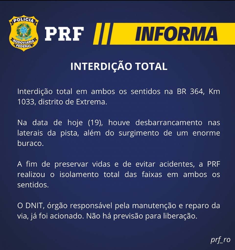 De acordo com o informe oficial, a interdição é total em ambos os sentidos na BR-364, km 1033, em Extrema, distrito de Porto Velho, capital de Rondônia.