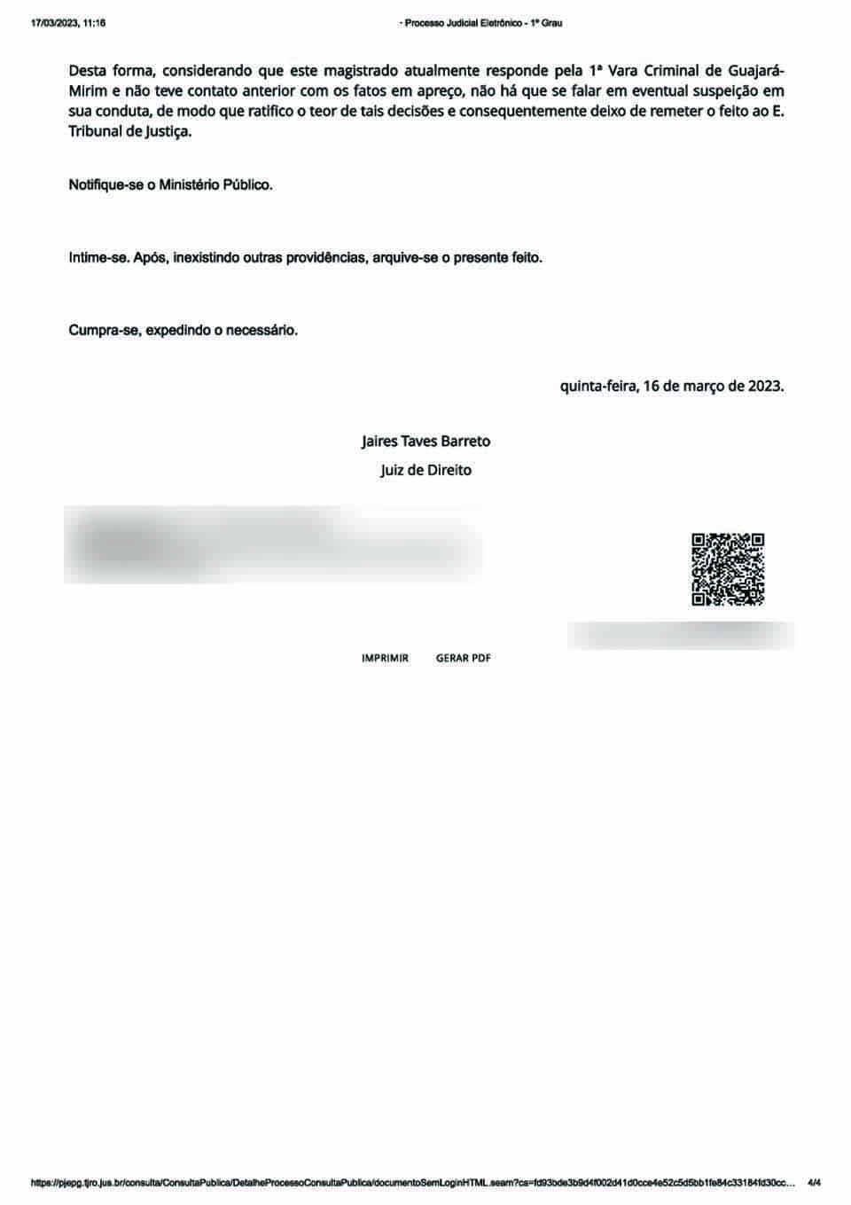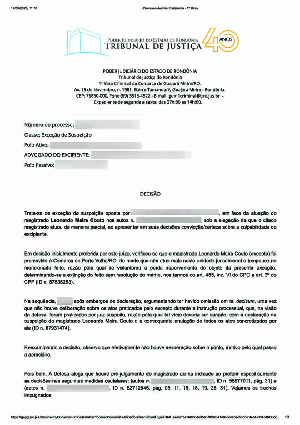 O pedido de decretação de suspeição foi julgado por Jaires Taves Barreto, da 1ª Vara Criminal da Comarca de Guajará Mirim.