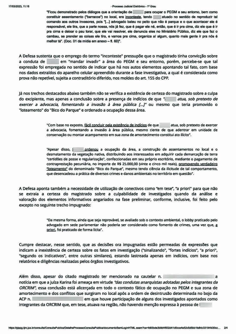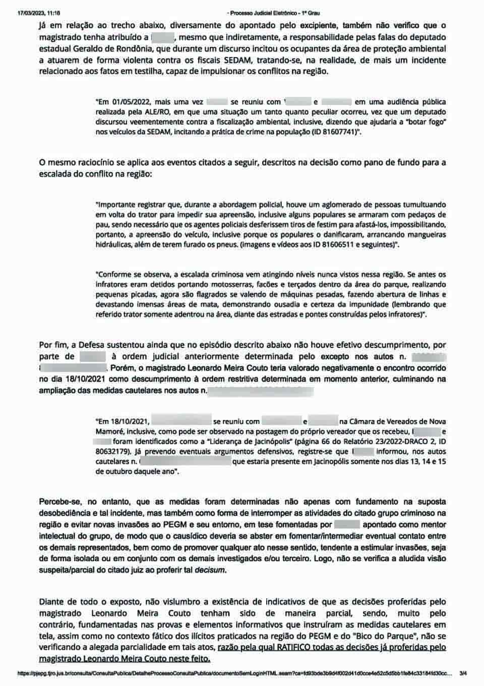 Para o julgador, não existiu “indicativos de que as decisões proferidas pelo magistrado Leonardo Meira Couto tenham sido de maneira parcial, sendo, muito pelo contrário, fundamentadas nas provas e elementos informativos que instruíram as medidas cautelares em tela, assim como no contexto fático dos ilícitos praticados na região do PEGM e do "Bico do Parque", não se verificando a alegada parcialidade em tais atos, razão pela qual RATIFICO todas as decisões já proferidas pelo magistrado Leonardo Meira Couto neste feito”.