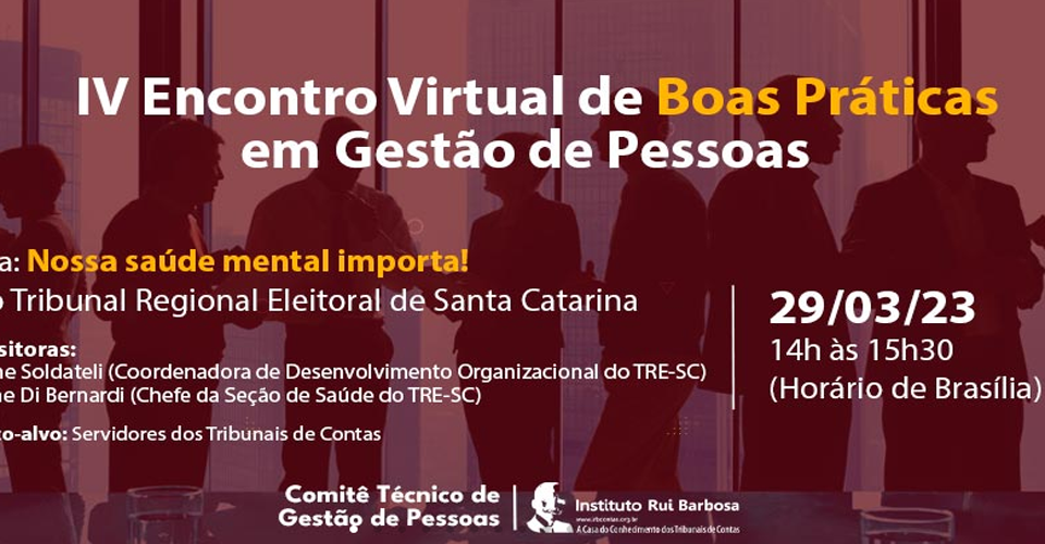 O IV Encontro Virtual acontecerá nesta quarta-feira (29/3), das 14h às 15h30 (de Brasília, ou seja, 13h às 14h30 de Rondônia), com apresentação do case Nossa saúde mental importa, com exposição das servidoras Luciane Soldateli (Coordenadora de Desenvolvimento Organizacional do TRE/SC) e Simone Di Bernardi (Chefe da Seção de Saúde do TRE/SC).