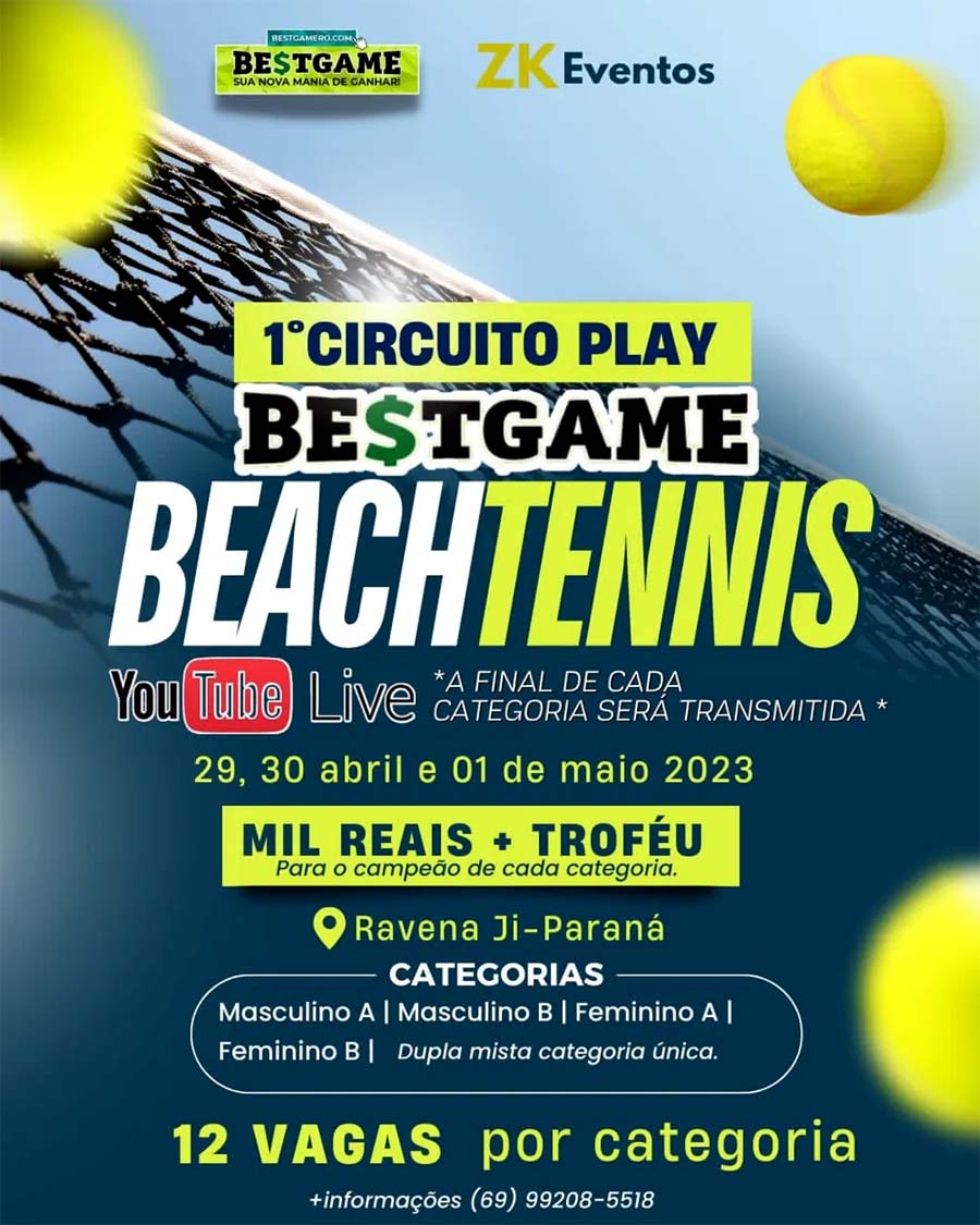A cidade de Ji-Paraná irá receber o 1º Circuito Play Bestgame de Beach Tennis durante os dias 29 de abril a 1 de maio. A competição é organizada pela ZK Eventos e será realizada na Arena Ravenna Beach Tenis.