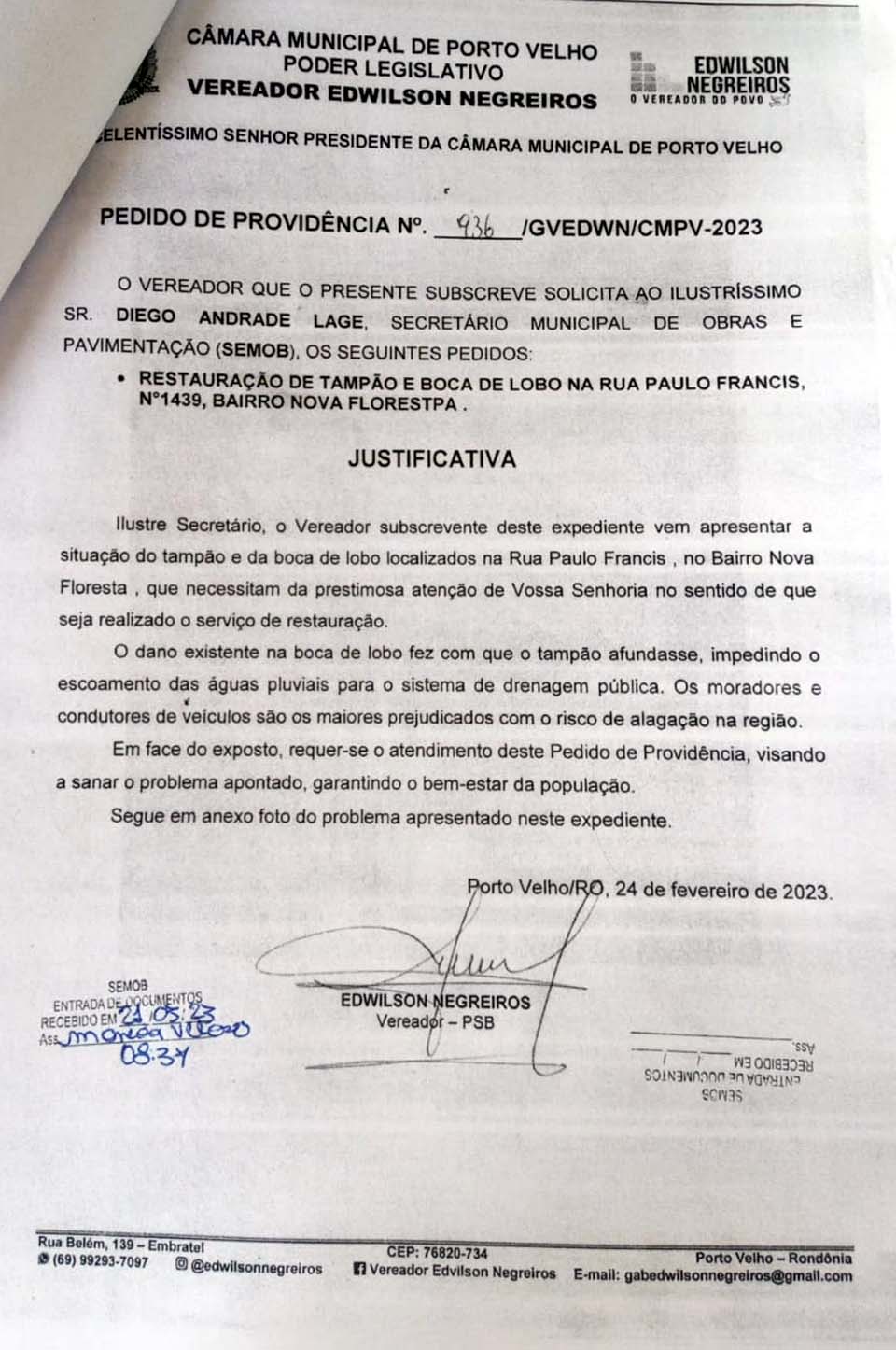 Porto Velho, RO – Em mais um pedido encaminha à Prefeitura de Porto Velho, o vereador da Capital Edwilson Negreiros, do PSB, solicitou providências quanto à restauração de tampão e “boca de lobo”.