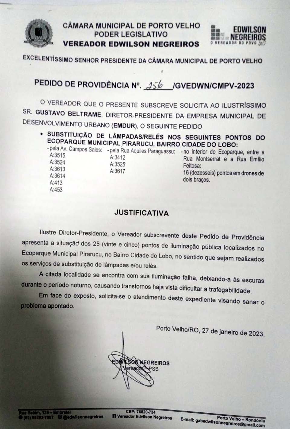 Porto Velho, RO – O vereador-presidente da Câmara Municipal de Porto Velho Edwilson Negreiros, do PSB, fez mais uma solicitação à Empresa de Desenvolvimento Urbano (EMDUR).