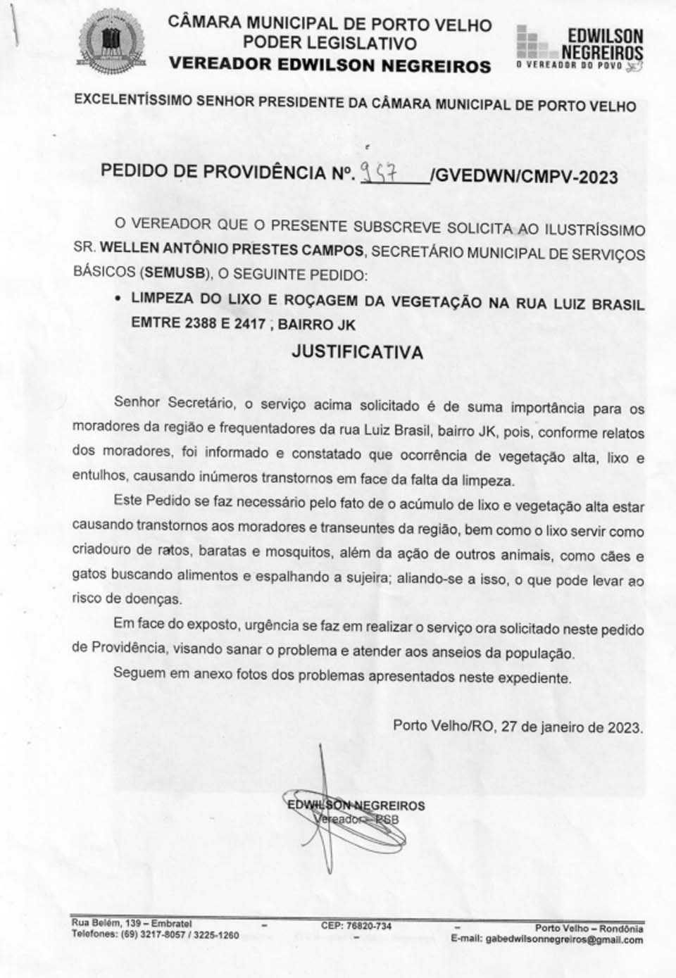Porto Velho, RO – O vereador Edwilson Negreiros, do PSB, encaminhou documento ao à Secretaria Municipal de Serviços Básicos (SEMUSB), sob titularidade de Wellen Antônio Prestes Campos, fazendo solicitações de serviços operacionais.