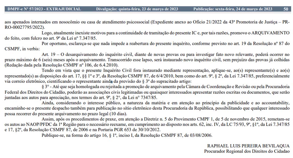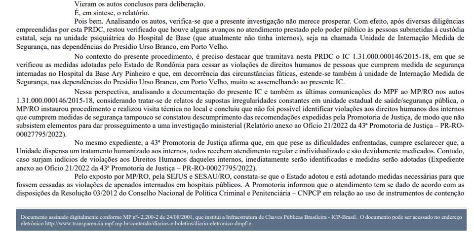 “Pois bem. Analisando os autos, verifica-se que a presente investigação não merece prosperar. Com efeito, após diversas diligências empreendidas por esta PRDC, restou verificado que houve alguns avanços no atendimento prestado pelo poder público às pessoas submetidas à custódia estatal, seja na unidade psiquiátrica do Hospital de Base (que atualmente não tinha internos), seja na chamada Unidade de Internação Medida de Segurança, nas dependências do Presídio Urso Branco, em Porto Velho”, anotou o membro do Ministério Público Federal de Rondônia (MPF/RO).