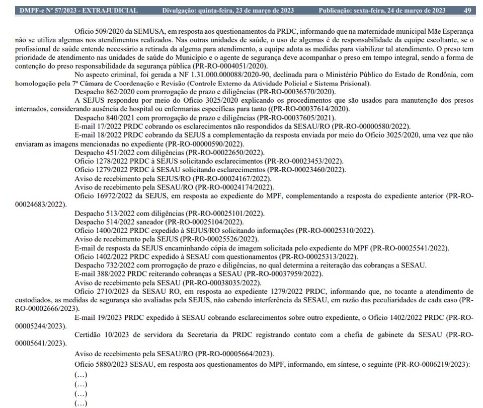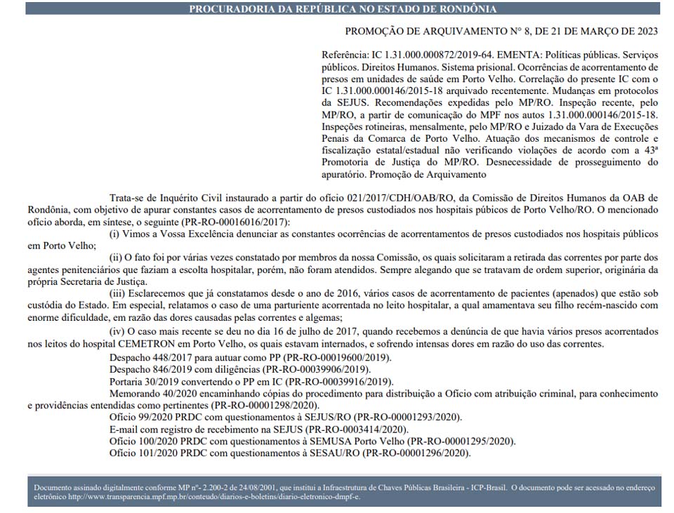 Em outra passagem, o procurador diz que conforme exposto pelo Ministério Público do Estado (MP/RO), Secretaria de Estado da Justiça (SEJUS/RO) e Secretaria de Estado da Saúde (SESAU/RO), “constata-se que o Estado adotou e está adotando medidas necessárias para que fossem cessadas as violações de apenados internados em hospitais públicos. A Promotoria informou que o atendimento tem se dado de acordo com as disposições da Resolução 03/2012 do Conselho Nacional de Política Criminal e Penitenciária – CNPCP em relação ao uso de instrumentos de contenção”, indicou.