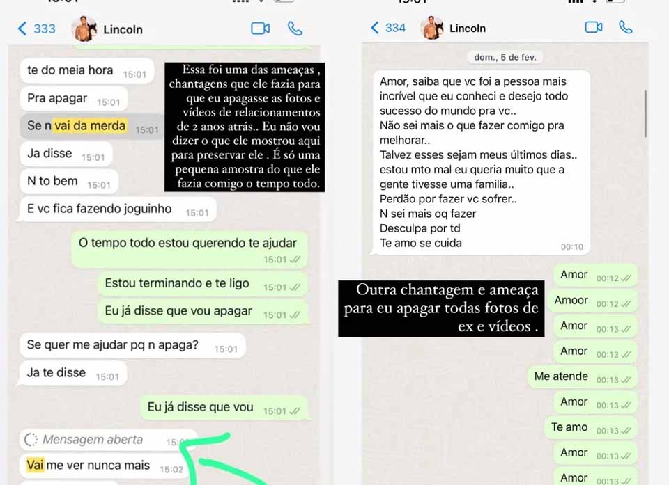 "Essa foi uma ameaças, chantagens, que ele fazia para que eu apagasse as fotos e vídeos de relacionamentos de dois anos atrás. Eu não vou dizer o que ele mostrou aqui para preservá-lo. É só uma pequena amostra do que ele fazia comigo o tempo todo", escreveu a ex-BBB. Na imagem, Lincoln diz que Gabi teria meia hora para apagar as publicações ou "vai dar merda".