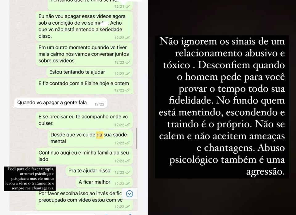 "Pedi para ele fazer terapia, arrumei psicóloga e psiquiatra, mas ele nunca levou a sério o tratamento e sempre me chantageava. Não ignorem os sinais de um relacionamento abusivo e tóxico. Desconfiem quando o homem pede para você provar o tempo todo sua fidelidade. No fundo quem está mentindo, escondendo e traindo, é o próprio. Não se calem e não aceitem ameaças e chantagens. Abuso psicológico também é uma agressão", finalizou.