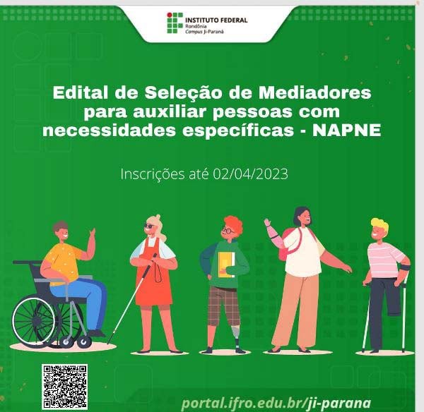 O Núcleo de Atendimento às Pessoas com Necessidades Específicas (Napne) do Instituto Federal de Educação, Ciência e Tecnologia de Rondônia (IFRO), Campus Ji-Paraná, seleciona estudantes bolsistas regularmente matriculados nas modalidades presencial e a distância (EaD) dos cursos técnicos e graduações. A seleção é para que atuem como monitores no processo de ensino e aprendizagem de estudantes com Necessidades Educacionais Específicas (NEE).