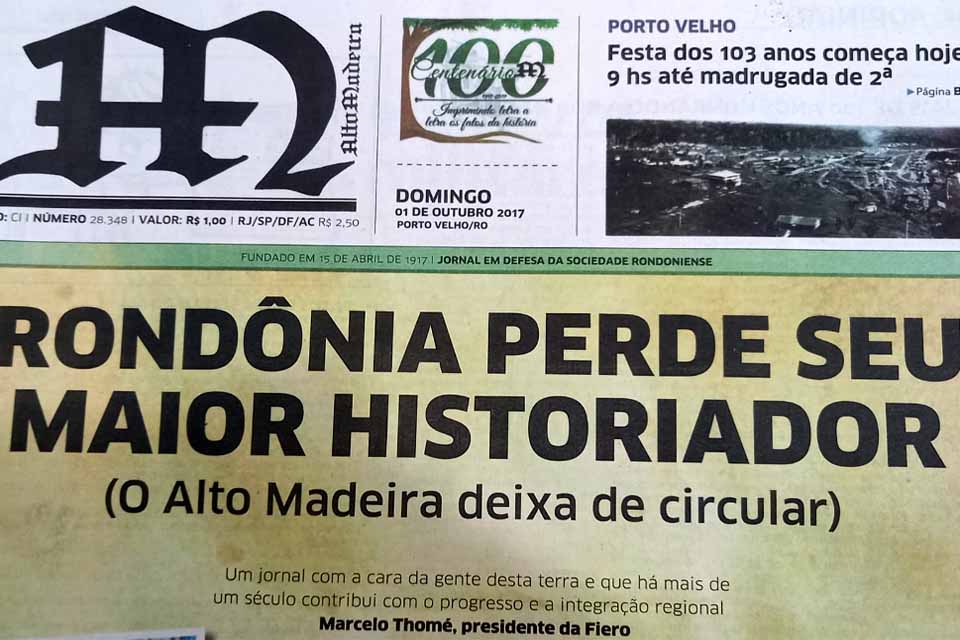 Há manchetes principais, com a seguir, fruto de todos da redação, mas quem deu o recorte final foi o Leivinha: “Rondônia perde seu maior historiador – o Alto Madeira deixa de circular”. Jornal que circulou durante mais de século, em sua última edição (1º de outubro de 2017)