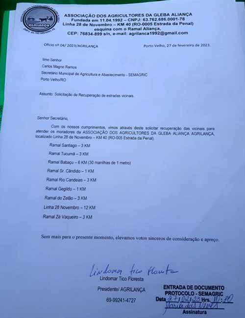 O pedido foi uma solicitação da Associação dos Agrcultores da Glebla Alinaça – AGRILANÇA, entidade rural localizada na Linha 28 de Novembro – KM 40 (RO 005 – Estrada da Penal).