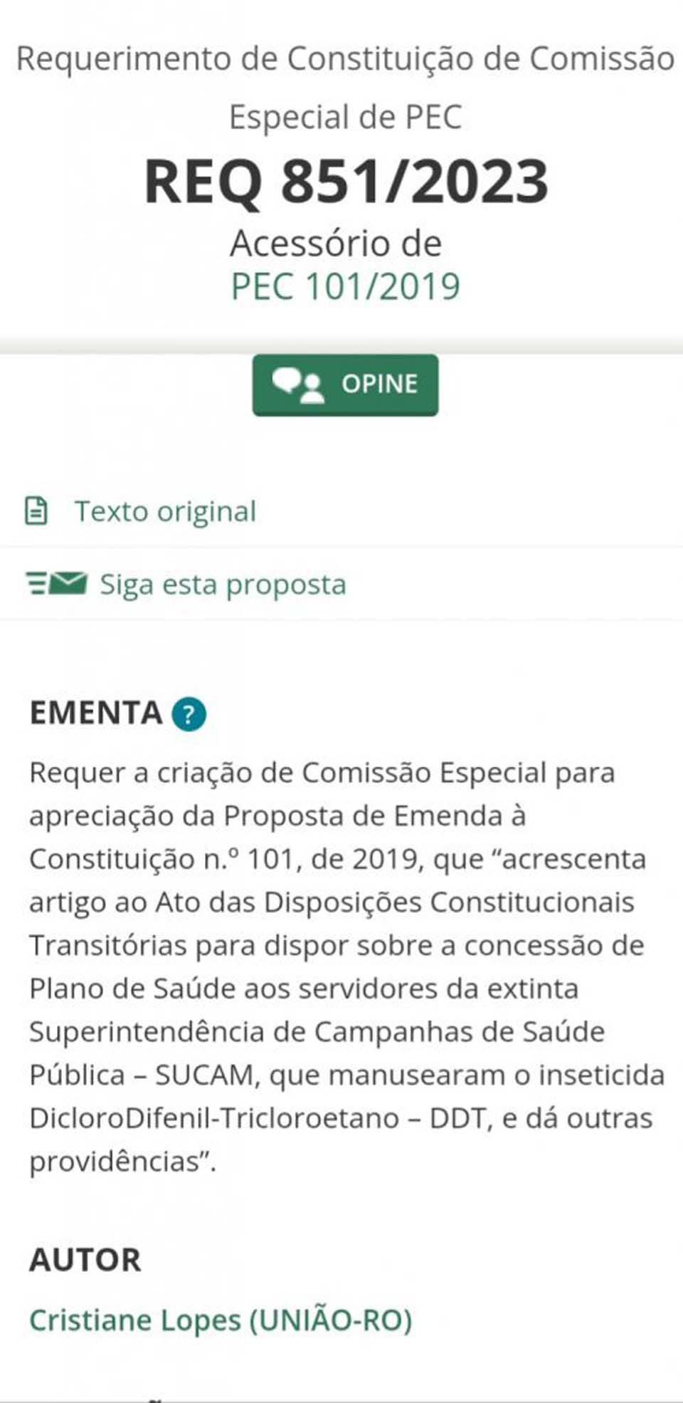 Na ocasião, a deputada informou que em atendimento às reivindicações do Sindsef-RO apresentou no dia 21/03, requerimento à Presidência da Câmara dos Deputados, solicitando que seja criada a Comissão Especial destinada a proferir parecer à Proposta de Emenda à Constituição (PEC 101/2019), que propõe sobre a concessão de Plano de Saúde aos servidores da extinta SUCAM, que manusearam o inseticida DDT.