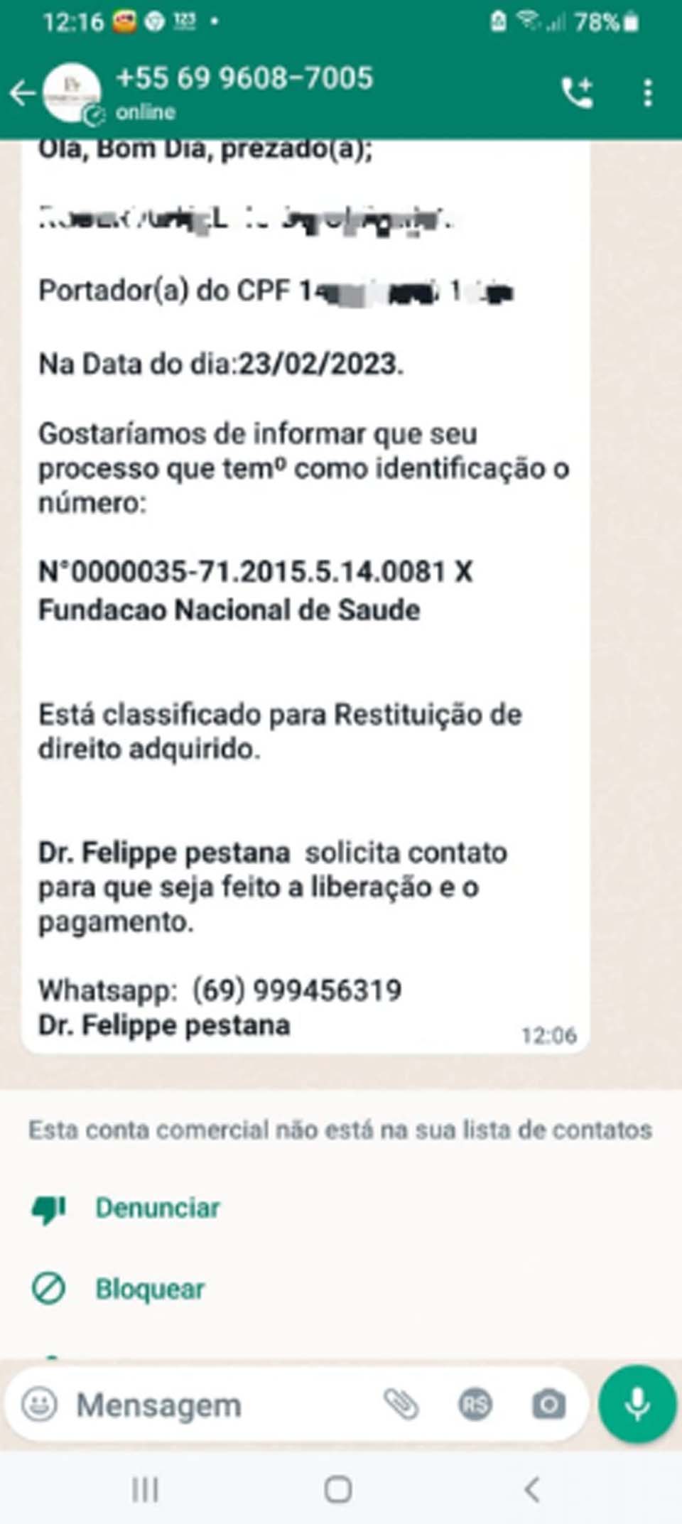 O Sindicato dos Servidores Públicos Federais do Estado de Rondônia (Sindsef-RO) alerta sobre ação criminosa de estelionatários que na tentativa de aplicar golpes, estão ligando e enviando mensagens de WhatsApp para filiados (ativos e aposentados), em nome do advogado Felippe Pestana (Escritório Fonseca & Assis), com informações falsas de que o filiado está classificado para restituição de direito adquirido, inclusive com números de processos (também falsos).