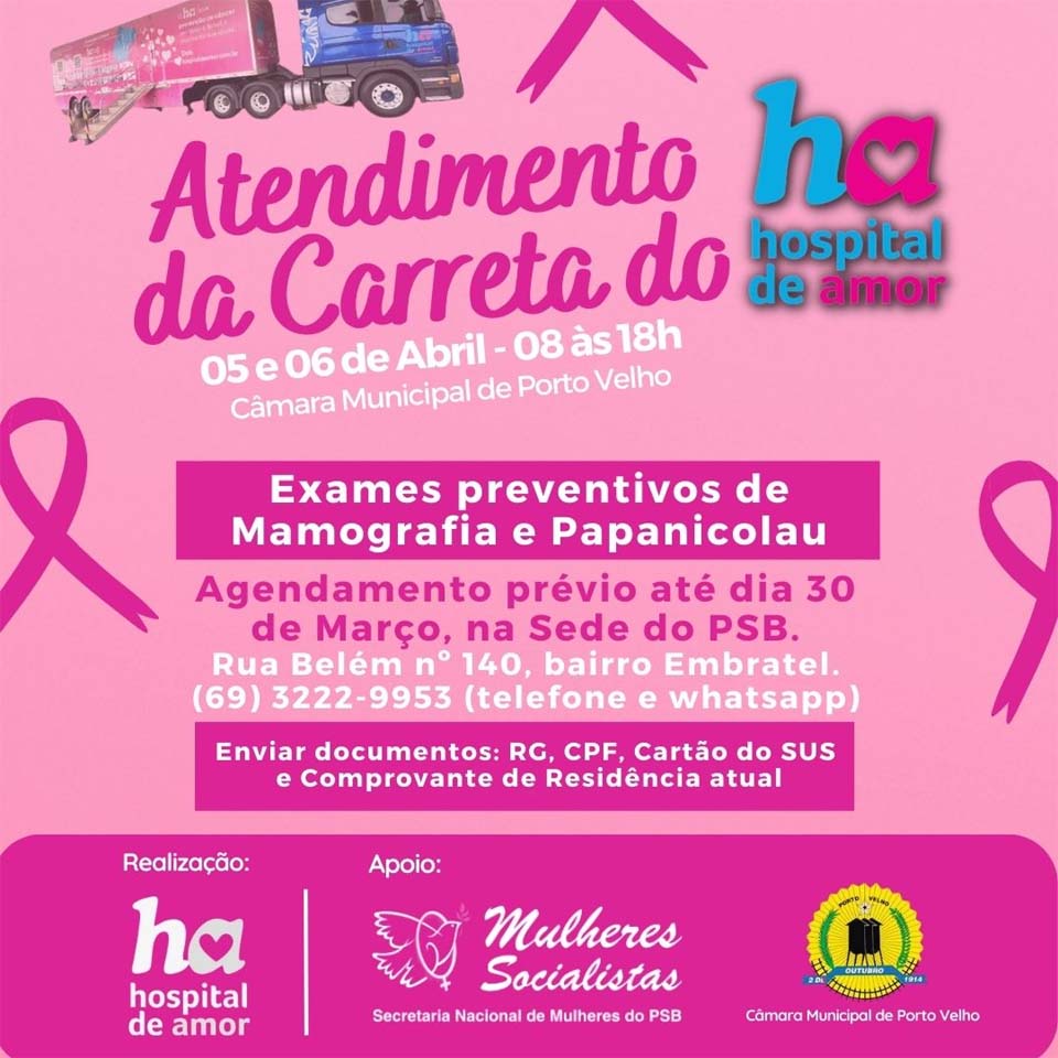 A realização é do Hospital de Amor com apoio da Secretaria Nacional de Mulheres do PSB e da Câmara Municipal de Porto Velho.
