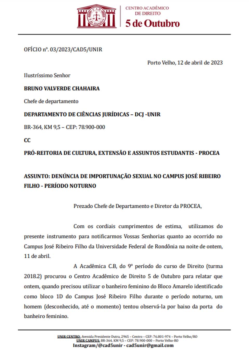 A medida foi tomada no dia 06 de abril de 2023, seis dias antes de receber nova denúncia apresentada pelo Centro Acadêmico 05 de Outubro.