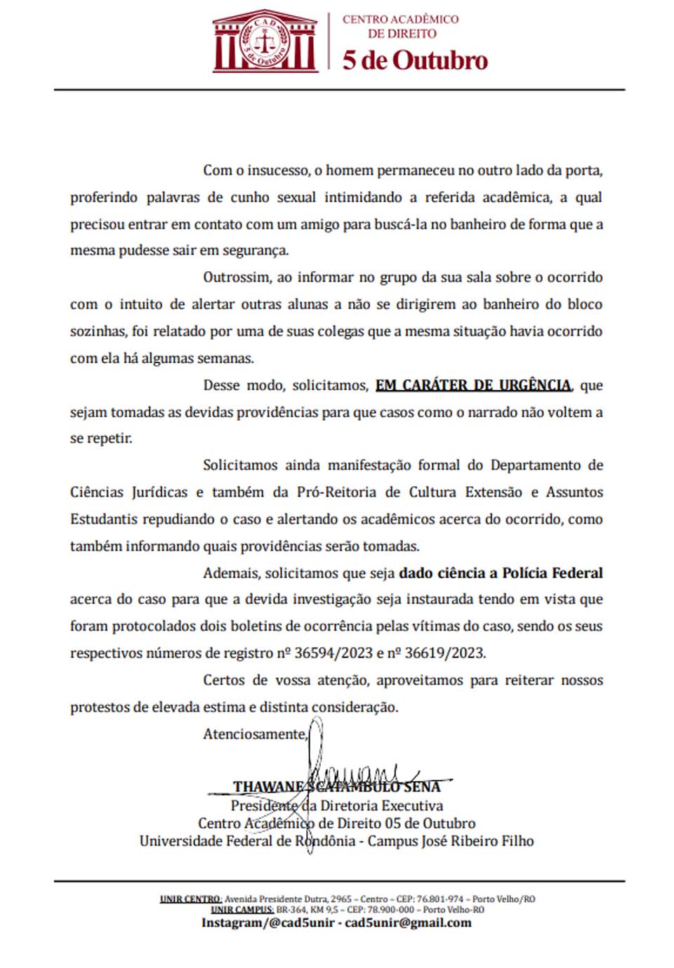 Na última quarta-feira, 12, Thawane Scatambulo Sena, presidente da Diretoria Executiva do organismo estudantil, apresentou documento a Chahaira contando o relato de uma acadêmica vítima de importunação sexual.