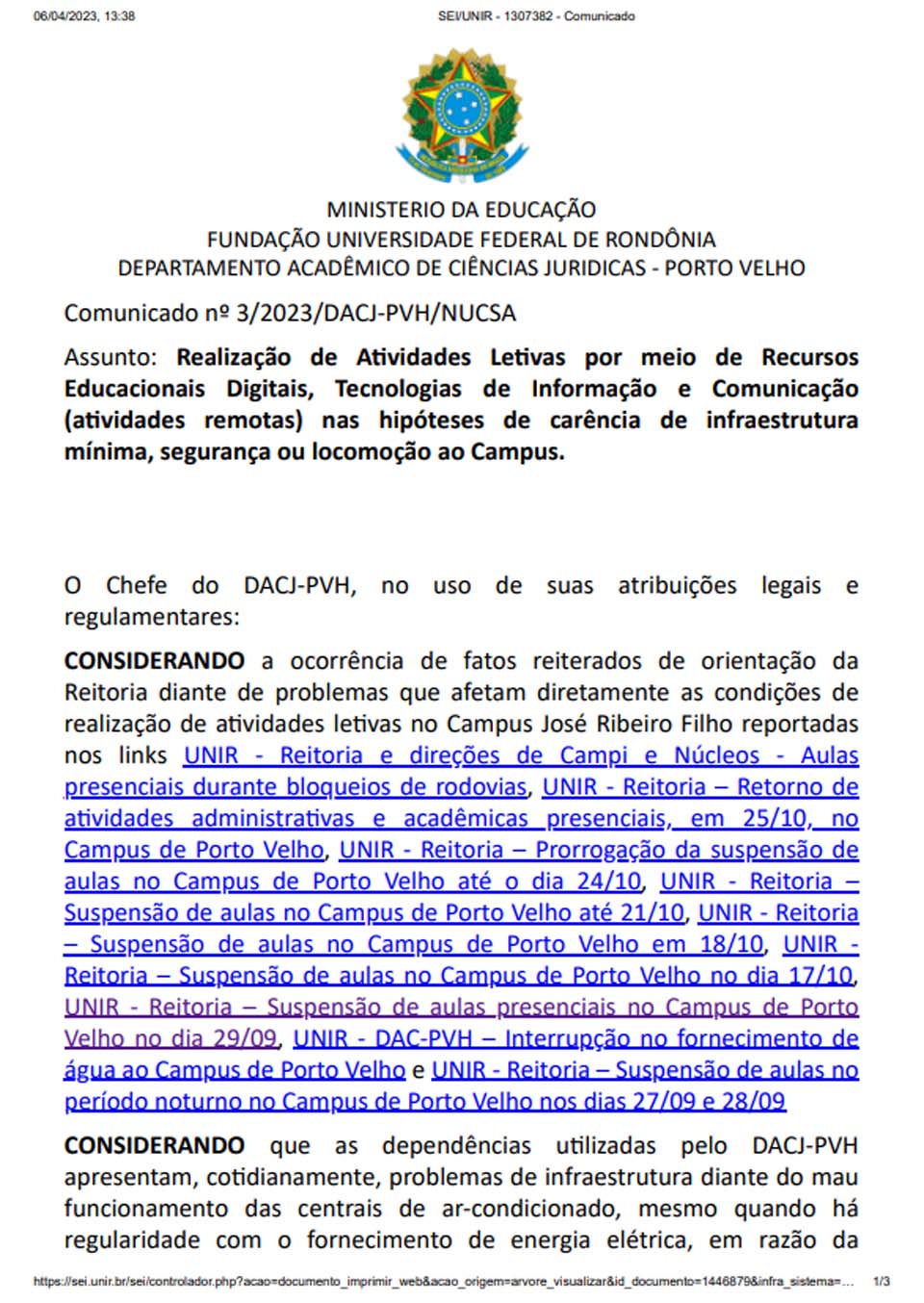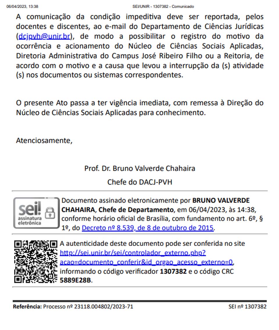 Porto Velho, RO – O advogado Bruno Valverde Chahaira, diretor do Departamento de Ciências Jurídicas da Universidade Federal de Rondônia (UNIR), autorizou “a realização da atividade letiva, devidamente adaptada, por meio de Recursos Educacionais Digitais, Tecnologias de Informação e Comunicação (atividades remotas) enquanto subsistir a condição obstativa/impeditiva”.