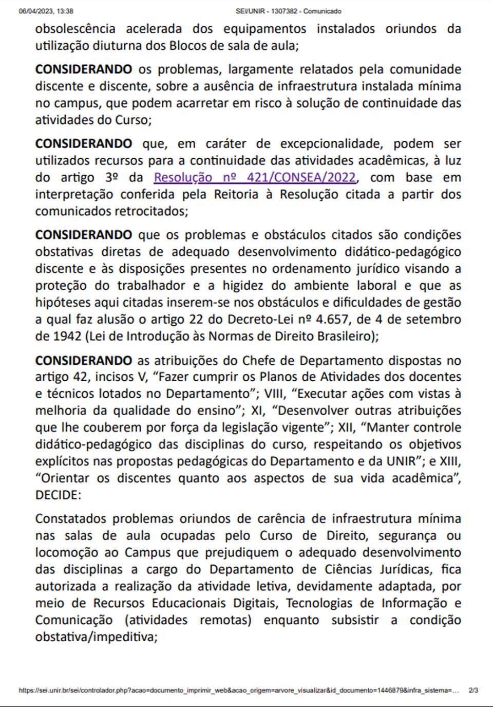 No caso, ele se refere a problemas estruturais em salas de aula no Campus José Ribeiro Filho, e também ausência de segurança necessária para o “adequado desenvolvimento das disciplinas” sob sua supervisão.
