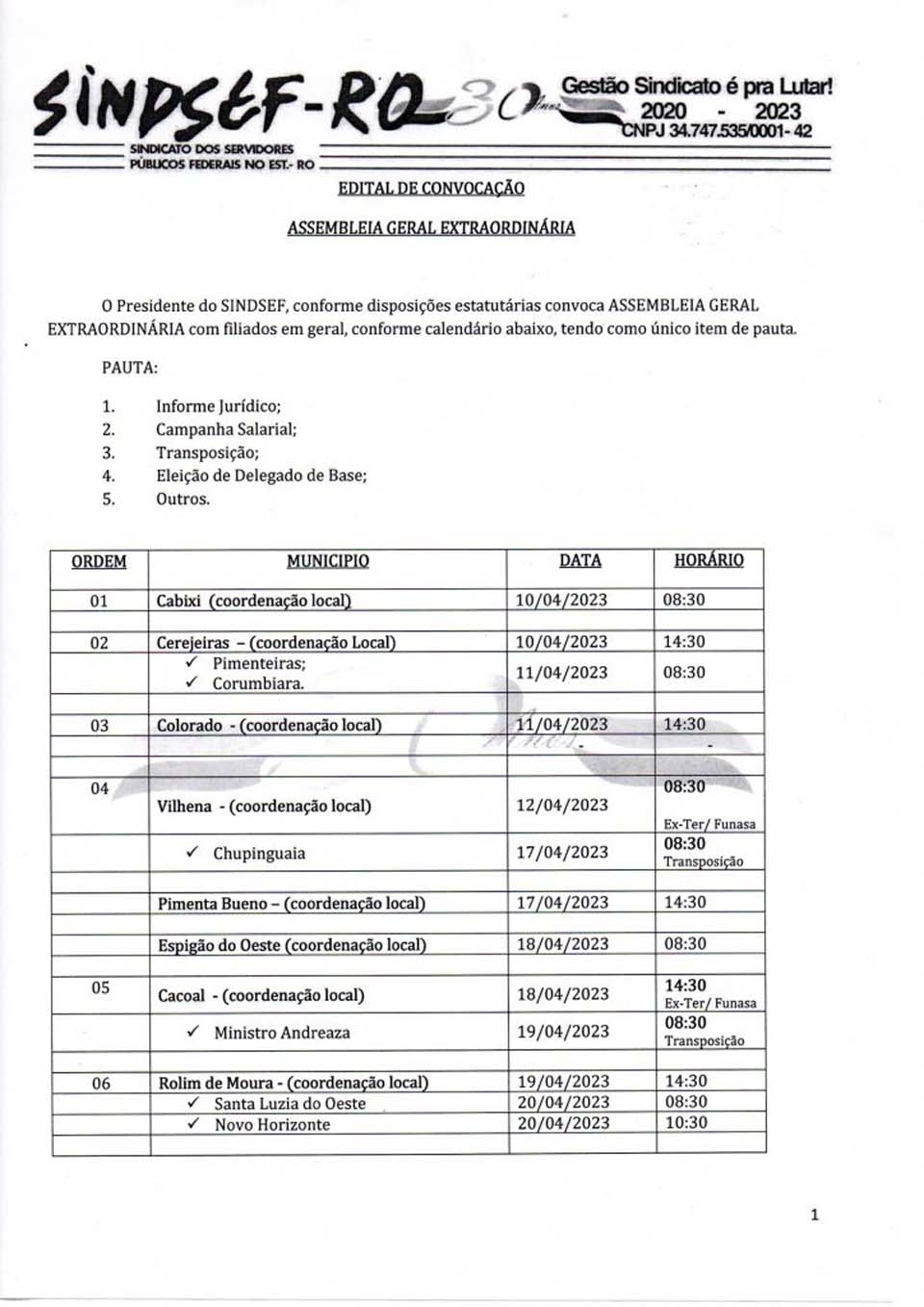 Confira datas e horários das assembleias nos municípios com filiados do SINDSEF-RO