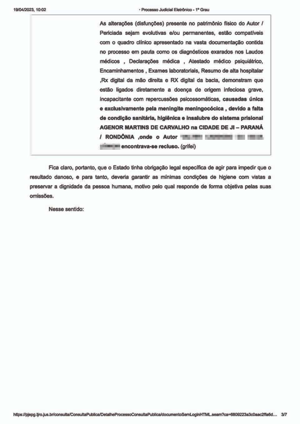 No interior da prisão, acrescenta, contraiu a forma grave da doença, sendo encaminhado ao . Afirma ter sido encaminhado ao Centro de Medicina Tropical de Rondônia (CEMETRON), em Porto Velho.