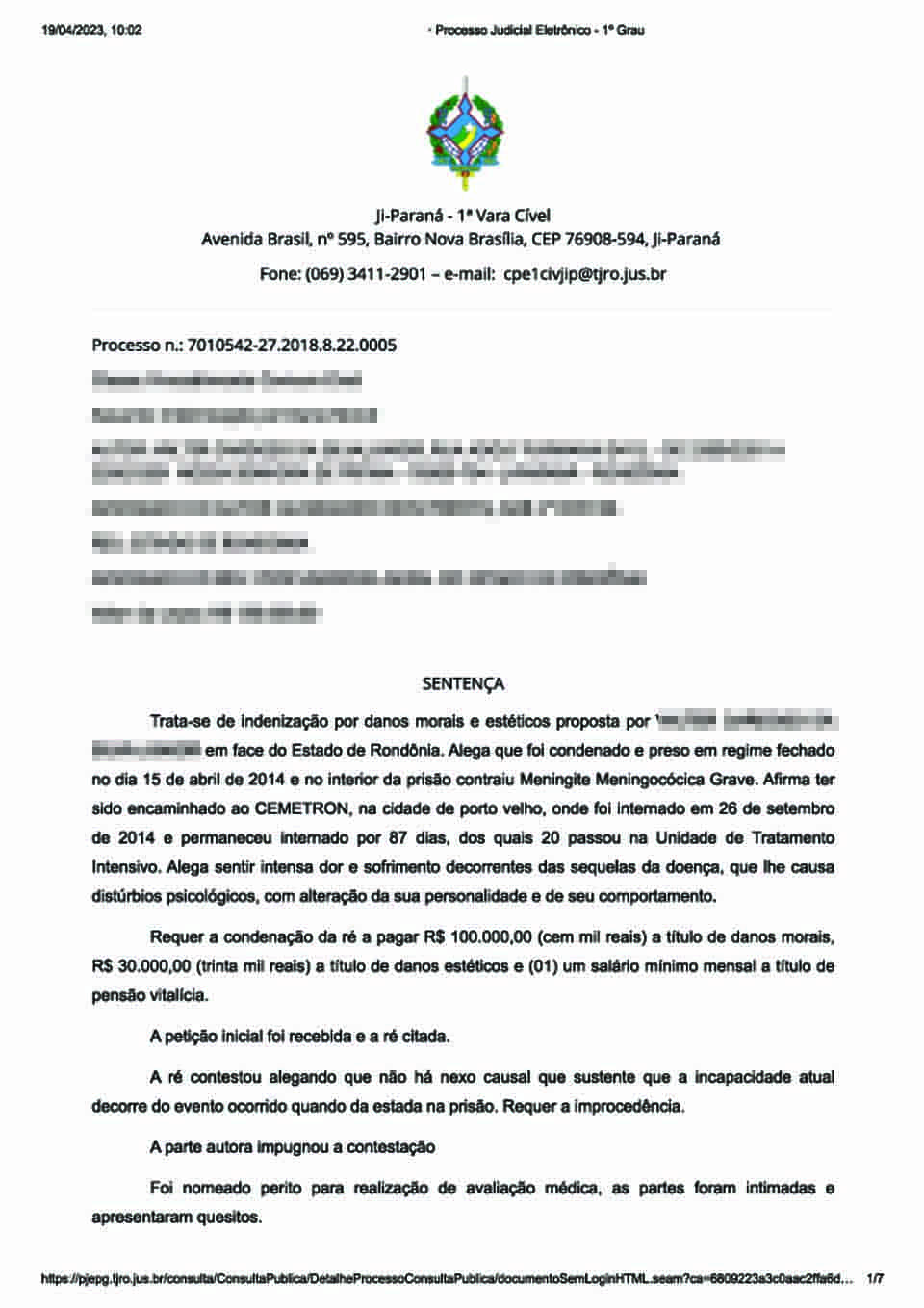 Porto Velho, RO – O juiz de Direito Leonardo Leite Mattos e Souza, da 1ª Vara Cível de Ji-Paraná, condenou o Estado de Rondônia a pagar R$ 80 mil em danos morais e pensão vitalícia a um ex-presidiário.