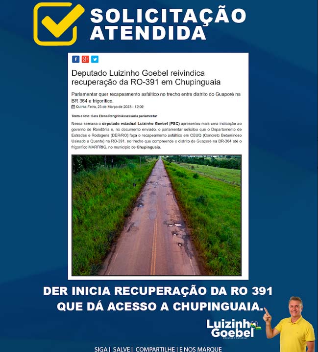 Após pedido do deputado estadual Luizinho Goebel (PSC) o governo de Rondônia, através do Departamento de Estradas de Rodagem (DER-RO) iniciou a recuperação da RO 391, trecho compreendido entre o município de Chupinguaia e o distrito do Guaporé, na BR 364.