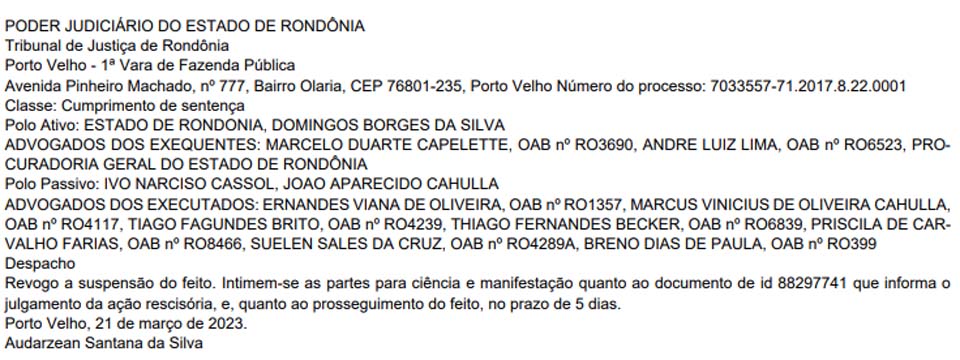 Já no mesmo dia, o magistrado Audarzean Santana da Silva, da 1ª Vara da Fazenda Pública de Porto Velho revogou a suspensão no processo de cumprimento de sentença.
