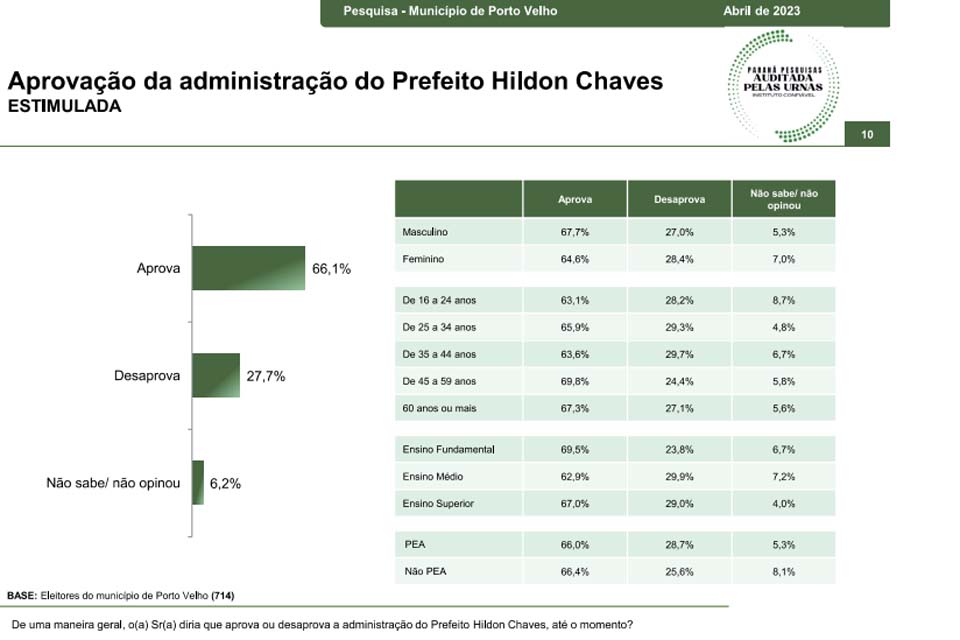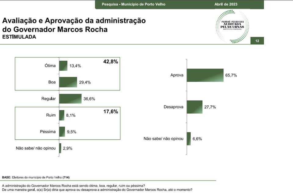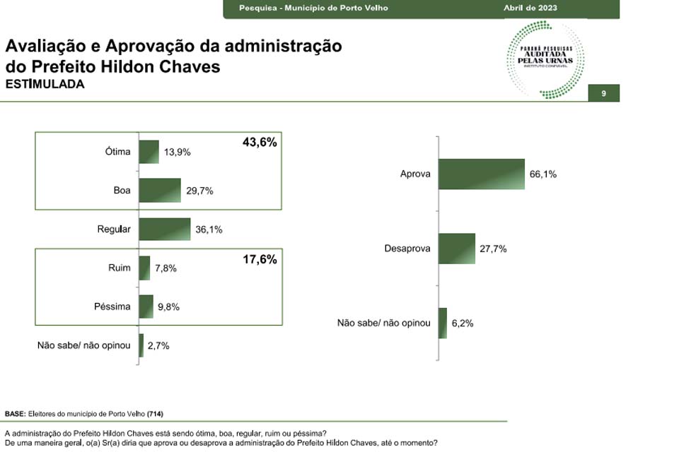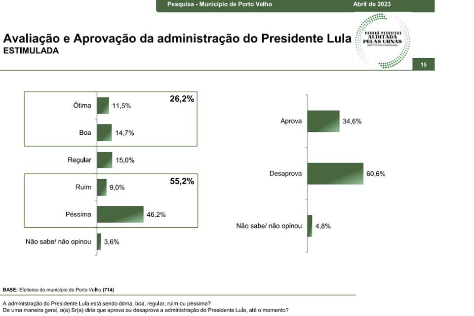 Porto Velho, RO – Além de avaliar a visão eleitoral dos questionados para 2024 (clique aqui para ver), o instituto Paraná Pesquisas também perguntou a 714 eleitores de Porto Velho sobre as gestões municipal, estadual e federal.