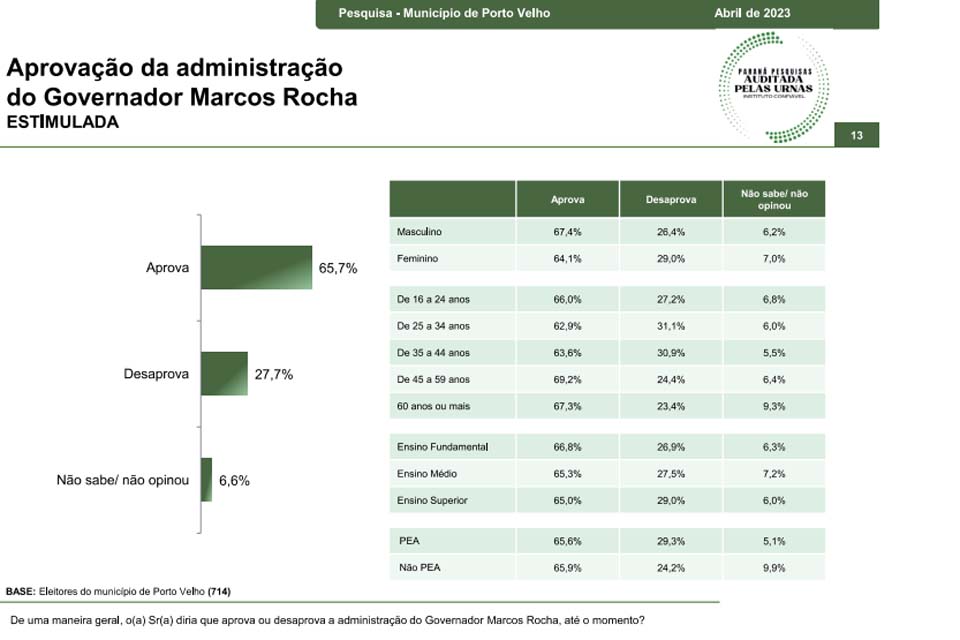 Sobre o mando no Palácio Rio Madeira, também operado por um reeleito, no caso, Coronel Marcos Rocha, ex-PSL, atual União Brasil, a aprovação chega à marca de 65,7%. Lado outro, 27,7% dos entrevistados o desaprovam.